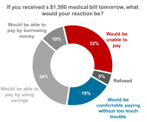 - 32% of Oregonian voters would not be able to pay an unexpected medical bill, with another 44% stating they would need to borrow from our savings, our family, our friends, or a bank. These impacts are not limited to one group – at every income level, a majority of voters would struggle to pay a surprise bill.